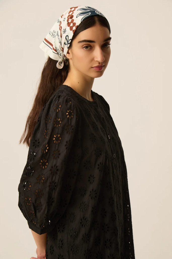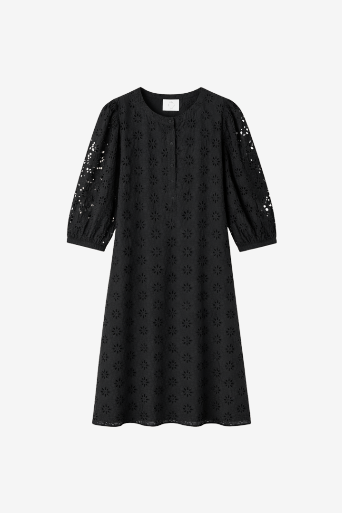 De Des Petits Hauts Sophocle Jurk in zwart is een elegante midi-jurk van luchtige katoenen broderie met een subtiel bloemenmotief. De jurk heeft een ronde hals, een knoopsluiting tot halverwege het lijfje en volumineuze mouwen tot net over de elleboog met een fijne elastische afwerking. De rechte, licht getailleerde snit zorgt voor een ontspannen maar vrouwelijke uitstraling.