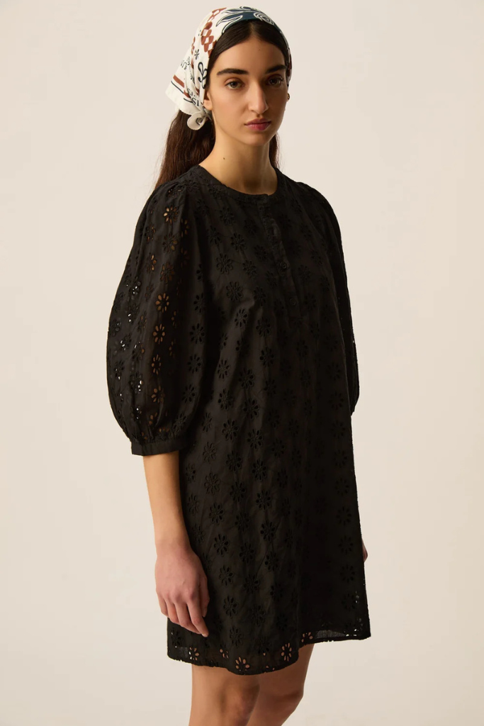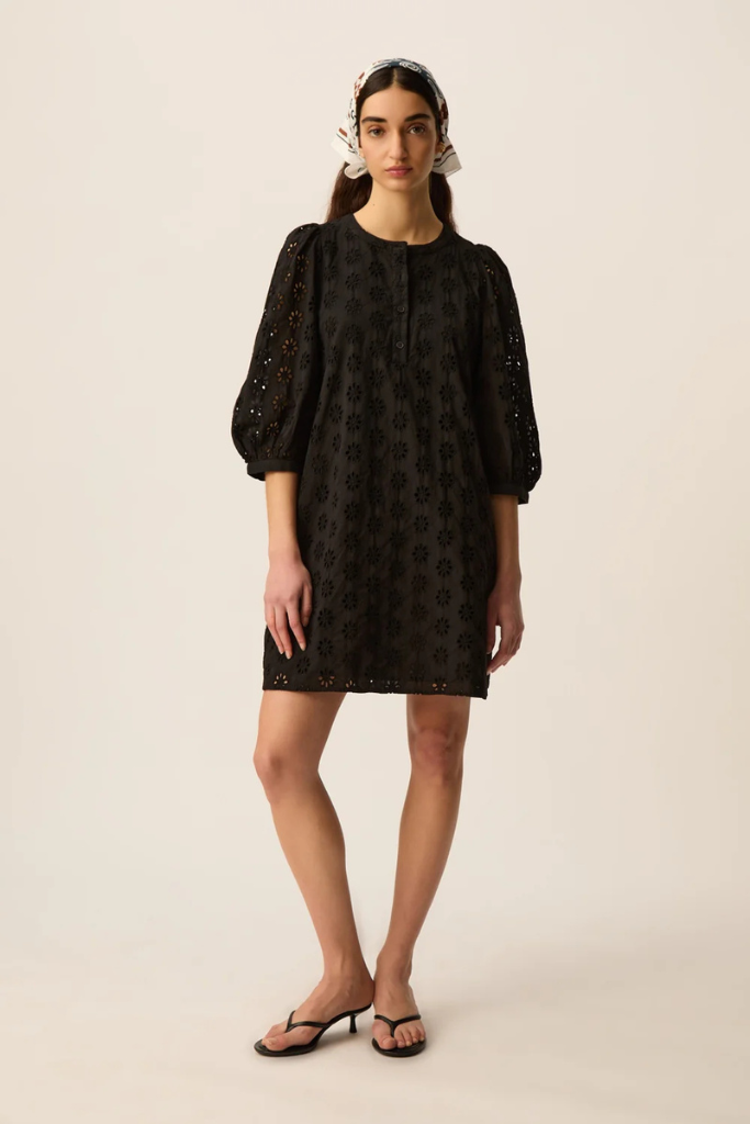 De Des Petits Hauts Sophocle Jurk in zwart – een verfijnde midi-jurk in luchtige broderie katoen met bloemenmotief, ronde hals en volumemouwen voor een vrouwelijke zomerstijl.