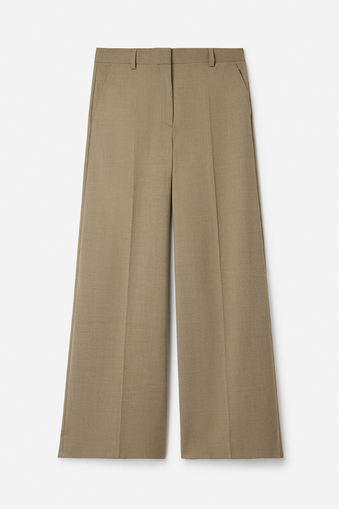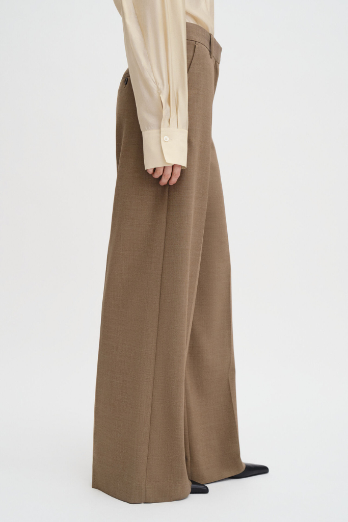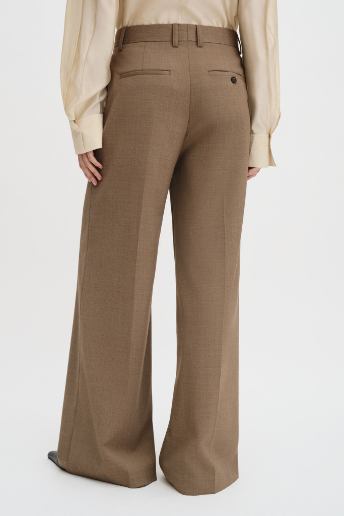 De broek is vervaardigd van een hoogwaardige wolmix met gerecycled polyester en een vleugje stretch, wat zorgt voor een comfortabele fit en een mooie, blijvende vorm. De mid-waist taille en de scherpe persvouwen geven een klassieke, geklede uitstraling, terwijl de zachte melange tint zorgt voor een subtiele, luxe finish. Voorzien van schuine steekzakken, paspelzakken achter en een verfijnde hook-and-eye sluiting.