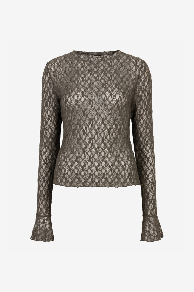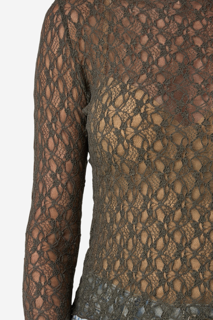 Account aanmakencombineert. De delicate mockneck en semi-transparante ¾-mouwen in fijn kant zorgen voor een elegante touch, terwijl de donkere olijfgroene tint diepte en warmte toevoegt. De top heeft een licht aansluitende pasvorm die soepel over het bovenlichaam valt en eindigt net op de heup, wat zorgt voor een flatterend silhouet.