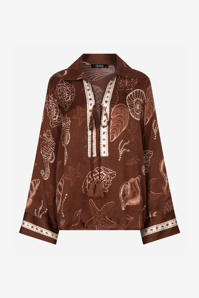 Account aanmakenDe Ibana Tarya Shell Zijde Top shell marrón is een uitgesproken en stijlvolle top die comfort en luxe moeiteloos combineert. De top is gemaakt van soepelvallende viscose met een zijdeachtige uitstraling, wat zorgt voor een elegante look en een prettig draaggevoel. De regular fit valt mooi langs het lichaam en is geschikt voor diverse silhouetten.