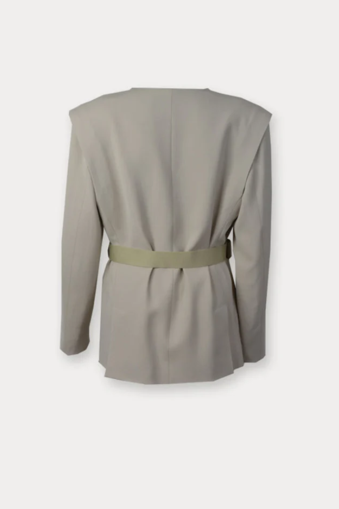 De IRO Jacket Molano beige is een stoere blazer jacket met een riem om de taille. Deze jacket heeft een speelse mouw en een uitgesneden kraag.