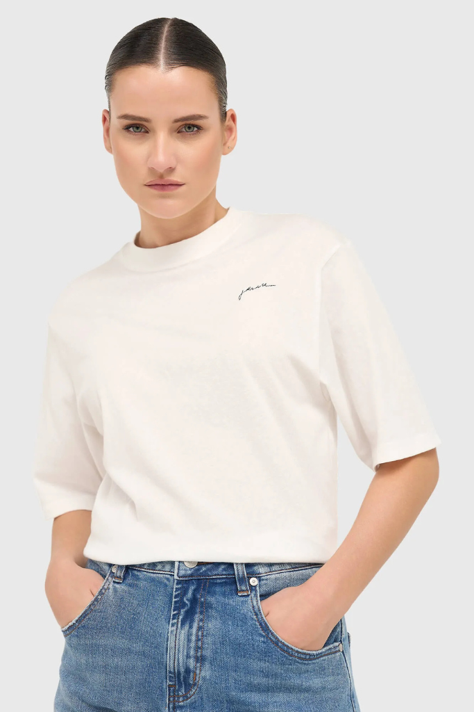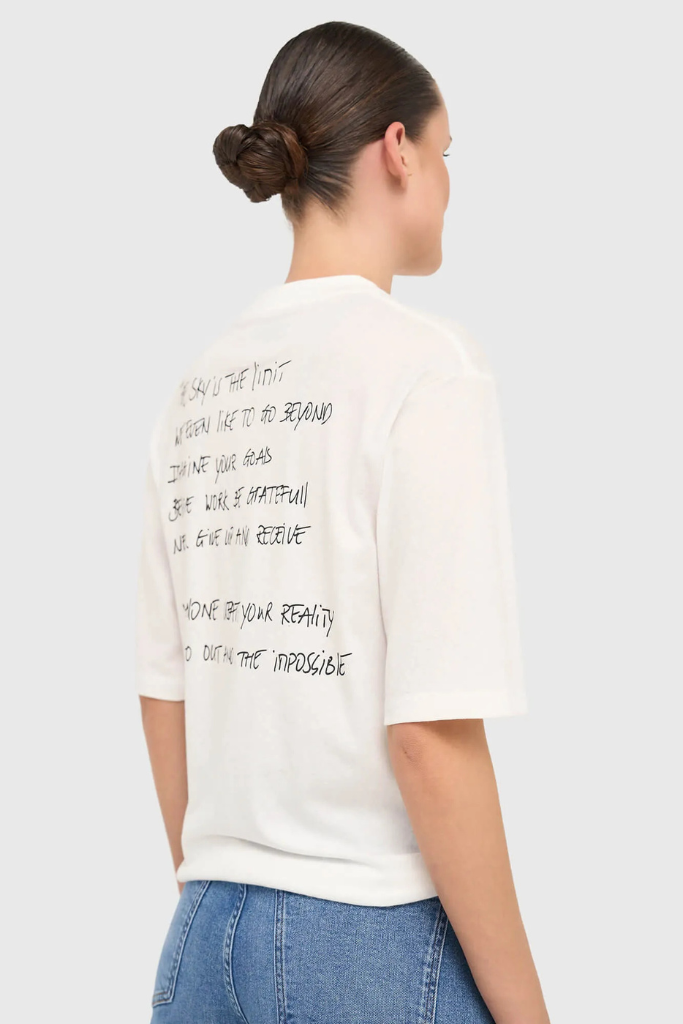 De Janice Adam T-shirt Tekst is een wit katoenen shirt met ronde hals, korte mouw en een rustige tekstprint. Minimalistisch, stijlvol en zacht.