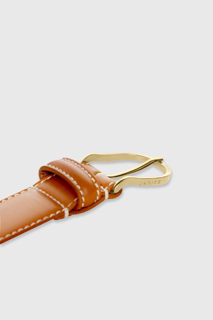 De Janice Chase riem cognac goud is een stijlvol en tijdloos accessoire, vervaardigd van hoogwaardig kalfsleer en met de hand gemaakt in Italië. De smalle riem van 3 cm breed heeft een elegante gouden gesp (3,2 x 4,2 cm) die perfect balanceert tussen stoer en verfijnd. Elk detail, van de fijne stiksels tot de luxe lederen lus, straalt vakmanschap uit.