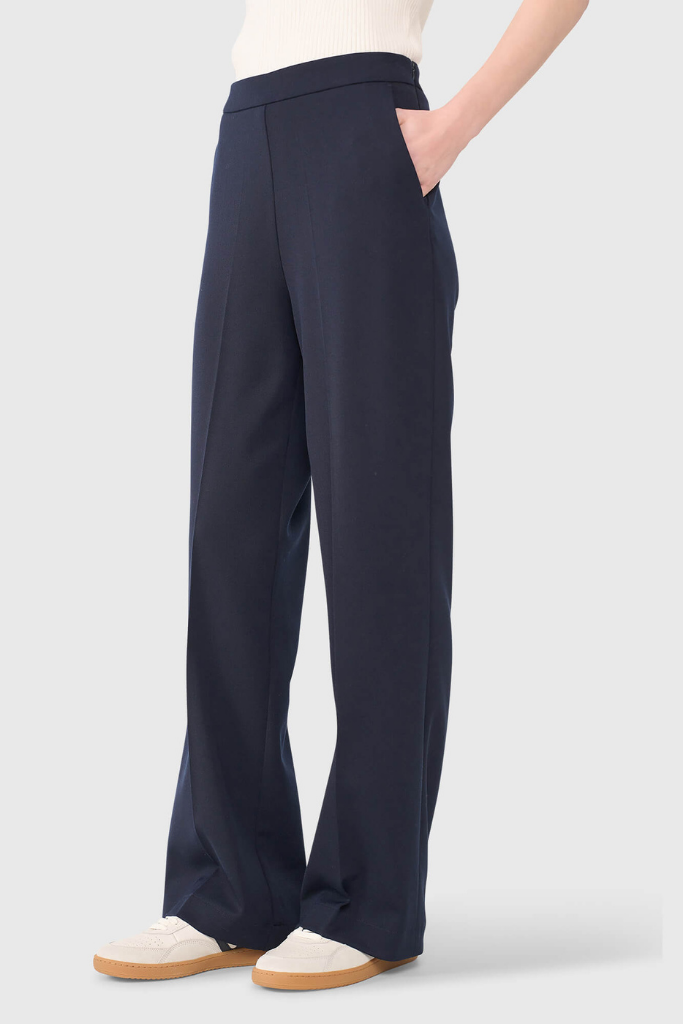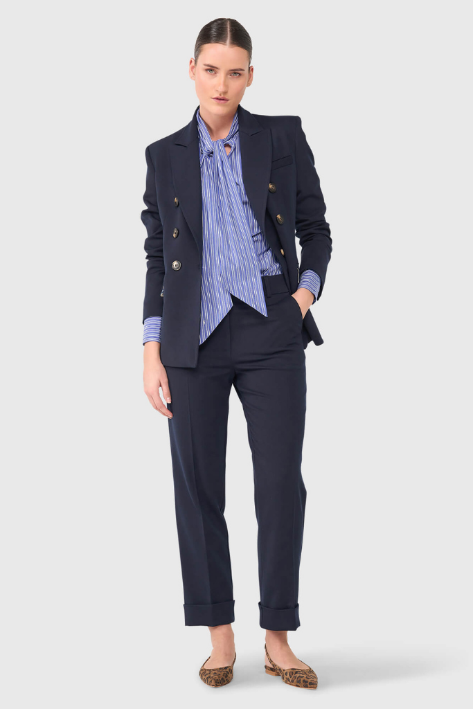 Account aanmakenDe Janice E Pete pantalon donkerblauw vormt de perfecte bijpassende pantalon bij de Connor blazer model 252. De pantalon is vervaardigd uit dezelfde hoogwaardige stretchstof (waarschijnlijk 69 % polyester, 24 % viscose en 7 % elastan), licht glanzend en soepel vallend – ideaal voor langdurig draagcomfort. De pasvorm is recht en klassiek met een flat front, exact op enkelhoogte, waardoor deze stijl modern én tijdloos oogt. Dit model accentueert de taille en biedt ruimte bij de heupen voor beweging zonder aan elegantie in te boeten. Combineer met de blazer voor een gesofisticeerde kantoorlook of draag los met lichte blouses en hakken voor een chic-casual uitstraling. De pantalon valt op maat: neem de gebruikelijke maat voor soepel laagjes dragen.
