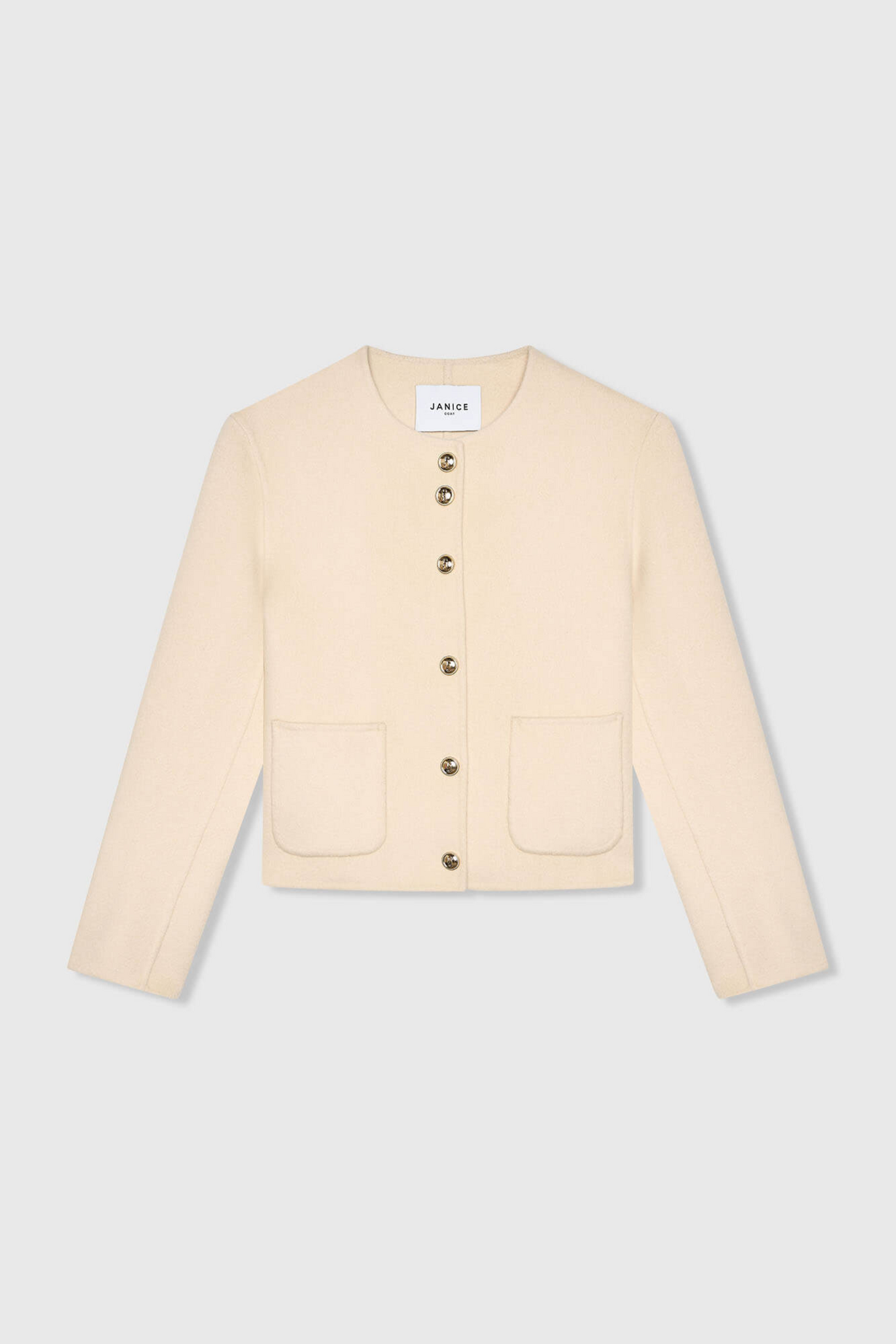 De Janice Vince Cashmere Blazer in beige is een elegant kort jasje dat verfijning en comfort perfect combineert. Dit tijdloze item is gemaakt van een luxe wol-cashmeremix, waardoor het niet alleen warm en zacht aanvoelt, maar ook een chique uitstraling heeft. De ronde halslijn, opgestikte zakken en goudkleurige knopen geven de blazer een klassieke en toch moderne look.