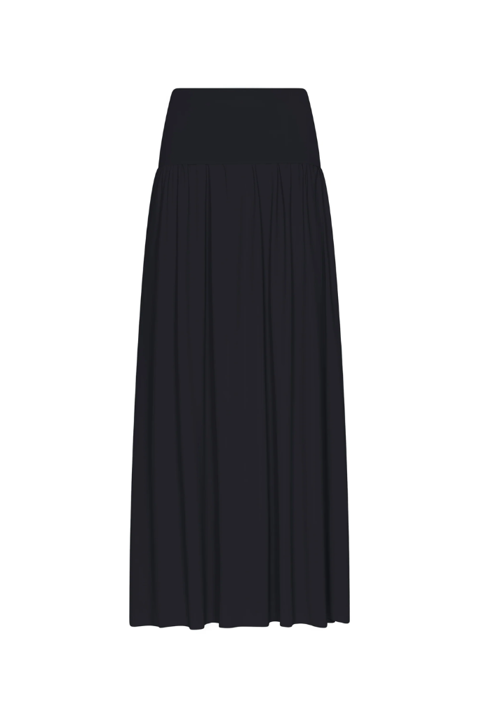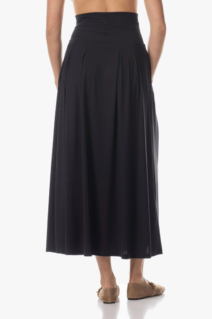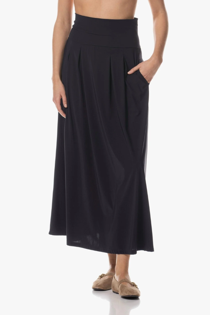 De Japan TKY Bakana rok deep black is een luchtige maxi rok in light travel kwaliteit met brede elastische tailleband en elegante plooien voor een soepele, vrouwelijke uitstraling.