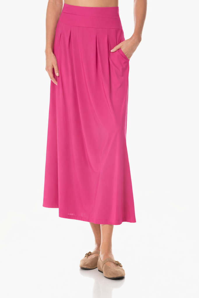 De Japan TKY Bakana Rok rose sorbet, een luchtige maxi‑rok van travel stof met geplooide gores en een brede elastische tailleband die elegant beweegt bij elke stap.