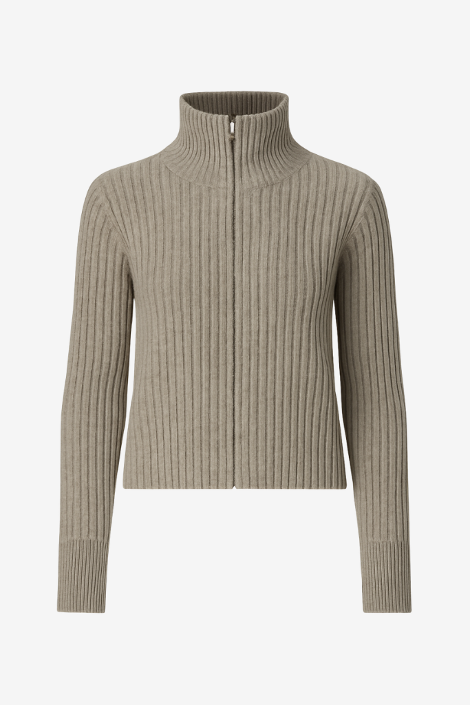 Pasvorm & details: mouwloos met ritssluiting tot bovenaan, ribboorden langs hals, armsgaten en zoom voor stevigheid en vormbehoud. De lengte valt rond de heup, ideaal om open of dicht te dragen.