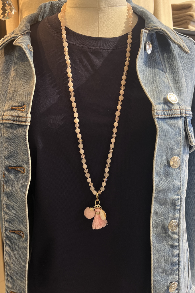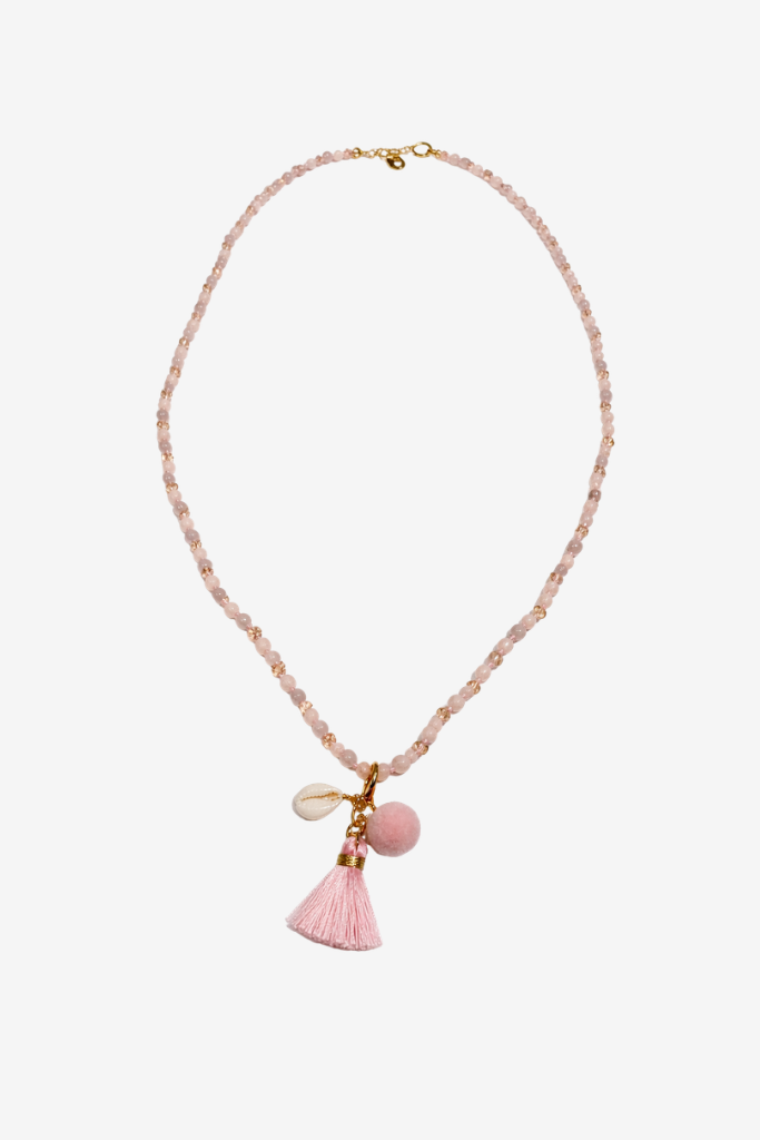 Account aanmakenDe Ketting Lang Rozekwarts roze is een elegante en romantische accessoire met een zachte uitstraling. De combinatie van rozekwarts kralen, een kwastje en een schelpdetail zorgt voor een speelse en vrouwelijke look.
