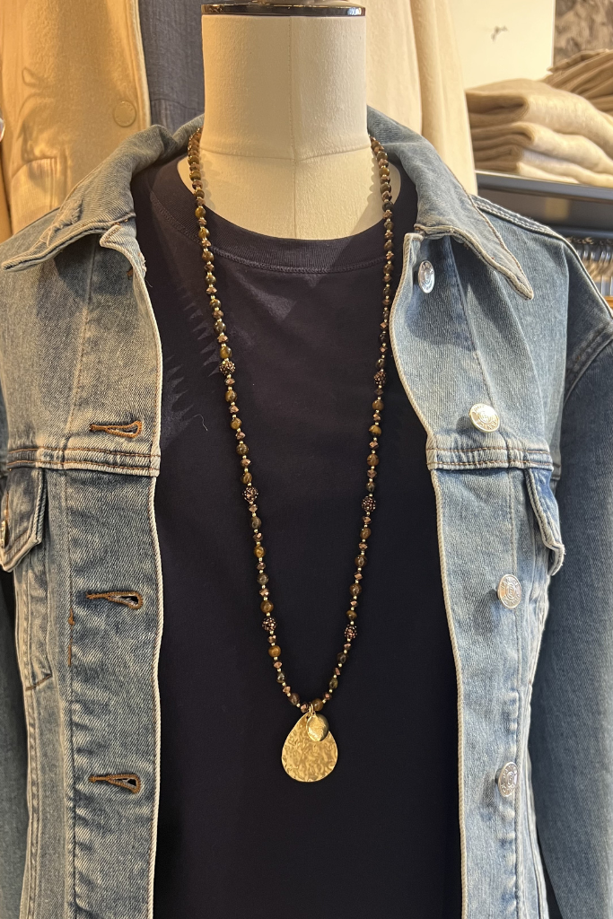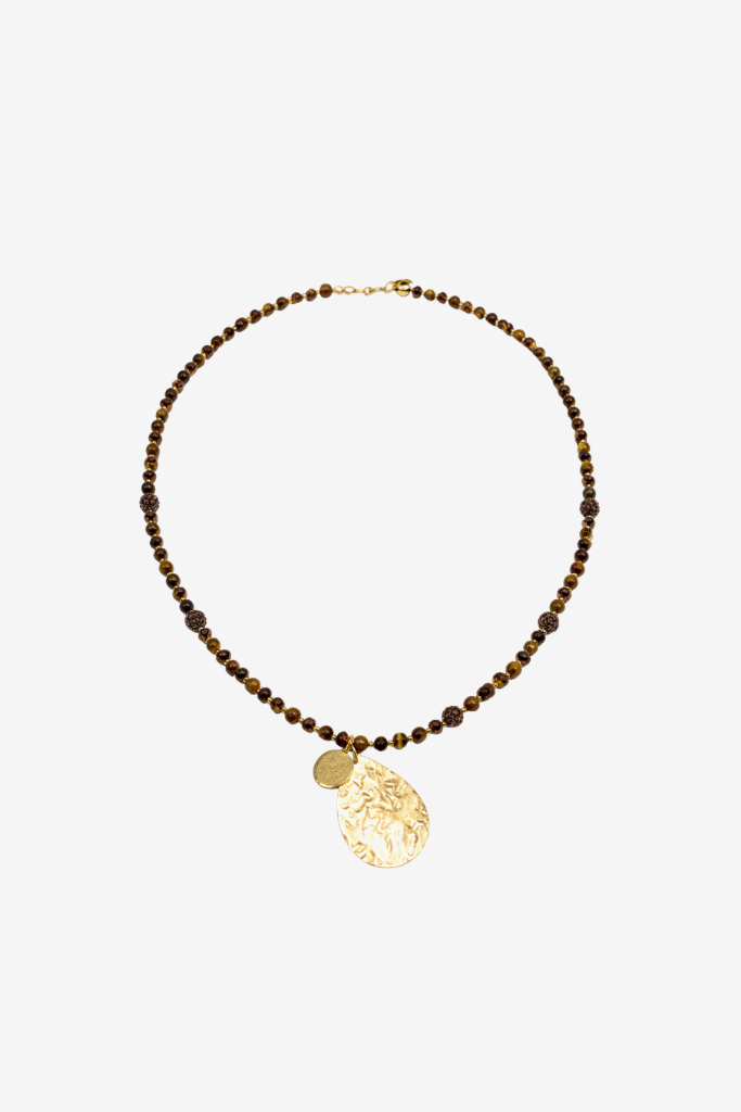 De Ketting Lang Tijgeroog is een stijlvol en tijdloos sieraad met een warme uitstraling. De combinatie van tijgeroog kralen in natuurlijke aardetinten en een gouden hanger zorgt voor een elegante en verfijnde look.