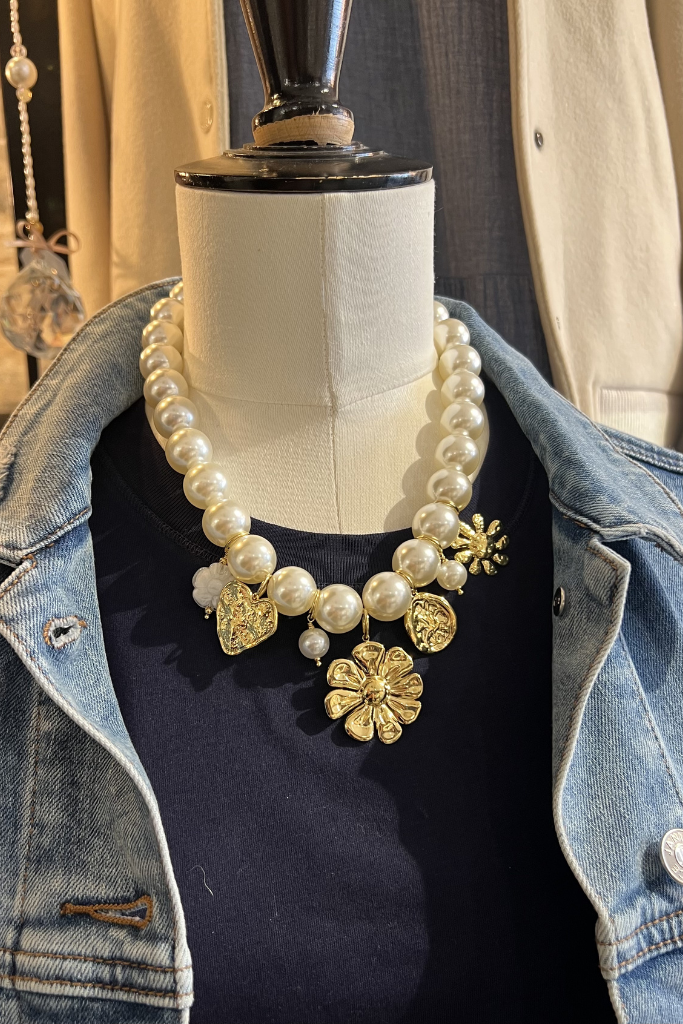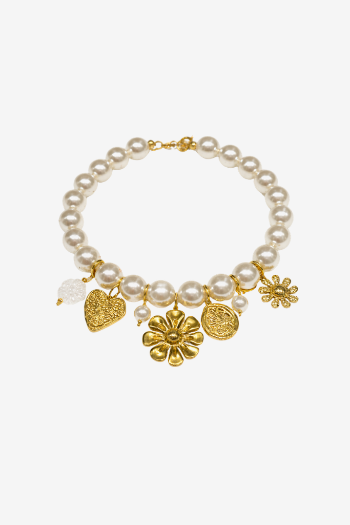 Account aanmakenDe Ketting Parel Groot Bloem is een speels en stijlvol sieraad dat direct opvalt. De combinatie van glanzende parels en meerdere gouden bedels, waaronder een grote bloem, hartje en details, zorgt voor een unieke en vrouwelijke uitstraling.