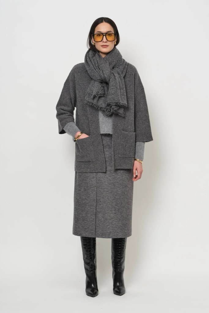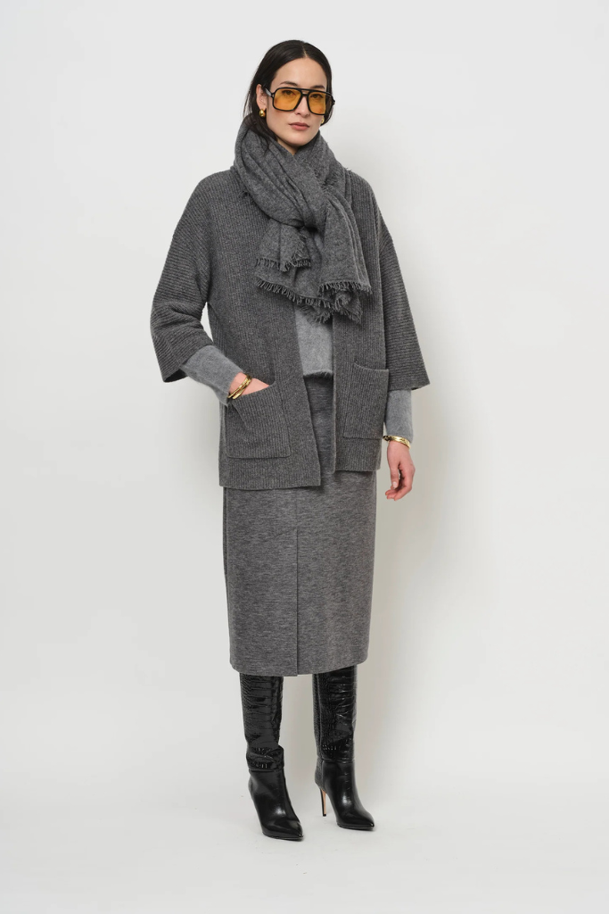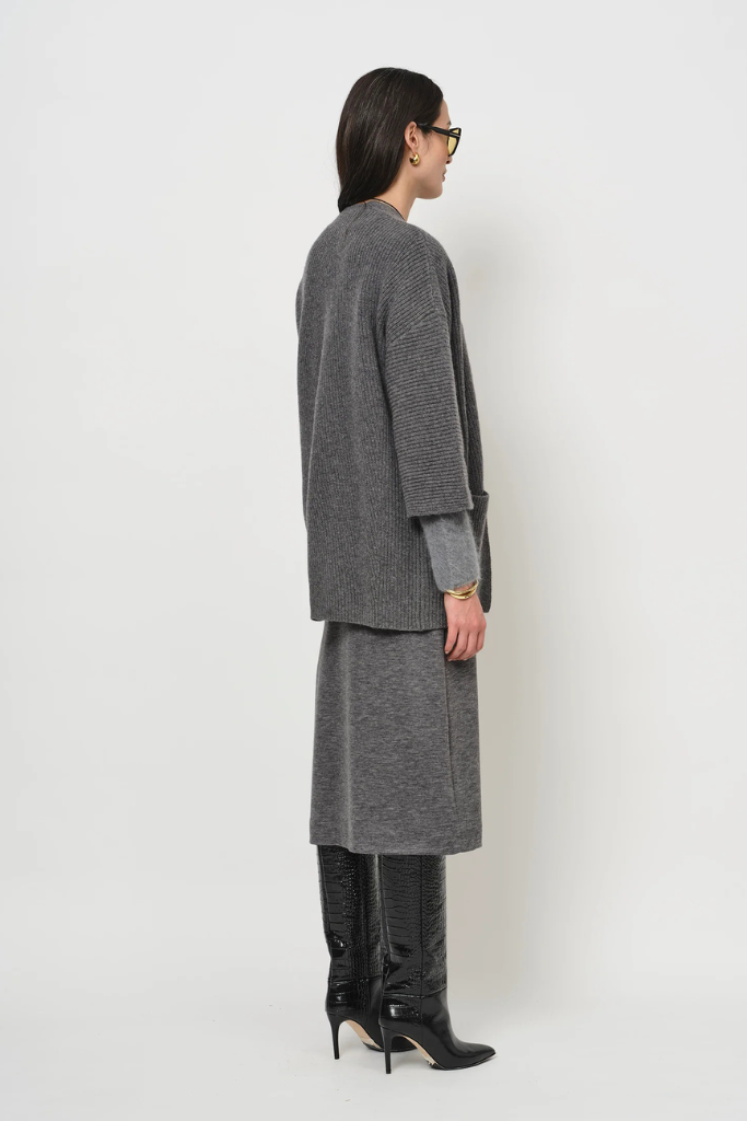 Account aanmakenHet vest is uitgevoerd in een zachte blend van 90% wol en 10% cashmere, vervaardigd in Italië voor een verfijnde afwerking. Dankzij de ribstructuur krijgt het breisel subtiele textuur en biedt het zowel warmte als lichtheid. De 3/4‑mouwen en de losse pasvorm geven een nonchalante elegantie, terwijl de brede patch‑zakken extra functionaliteit toevoegen. De lengte valt tot halverwege het dijbeen, wat een moderne, verlengende silhouetlijn creëert. Dit vest laat zich prachtig dragen over een blouse of fijn truitje, onder een mantel of als chic bovenstuk op een rok of pantalon – perfect voor werk, weekend of een ontspannen avond. Het valt royaal door de losse fit; kies bij twijfel uw normale maat voor een comfortabele laaglook.
