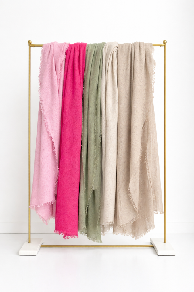 De sjaal heeft een royaal formaat en een lichtgewicht structuur, afgewerkt met verfijnde franjes voor een tijdloze afwerking. Dankzij de hoogwaardige kwaliteit valt hij soepel en draagt hij uiterst comfortabel.