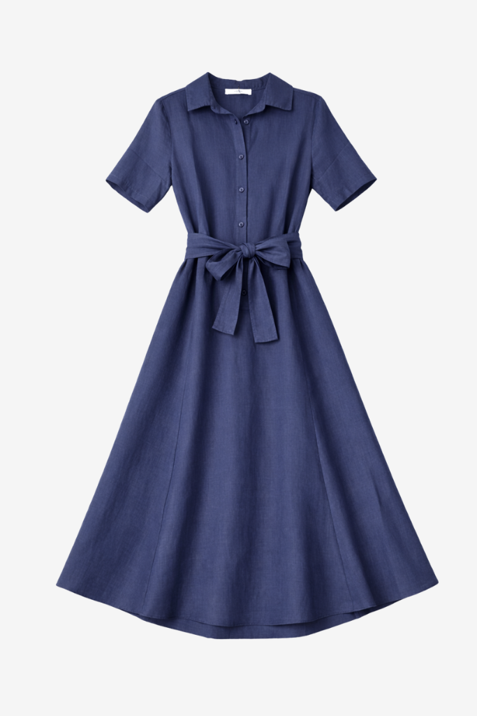 De diepe navy tint geeft een krachtige, elegante uitstraling die gemakkelijk te combineren is. De klassieke overhemdkraag, korte mouwen en doorlopende knoopsluiting zorgen voor een verfijnde basis. De bijpassende tailleceintuur accentueert subtiel de taille en creëert een vrouwelijke A-lijn die soepel langs het lichaam valt. De lengte geeft een elegante, verlengende lijn aan het silhouet.