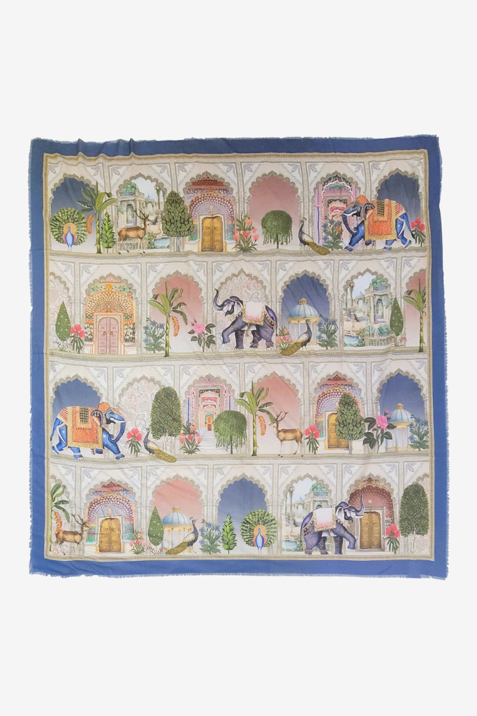 De LaSalle Scarf Royal Safari is een elegante, vierkante shawl gemaakt van een verfijnde mix van 80% modal en 20% zijde. De royale print toont een kleurrijk tafereel vol exotische dieren, sierlijke bogen, palmbomen en Indiase architectuur. De diepe blauwtint langs de randen zorgt voor een rijke omlijsting van het artwork. Deze shawl voelt licht en zacht aan, en is dankzij het luchtige materiaal perfect voor elk seizoen. Draag de sjaal losjes om de schouders, als statement accessoire over een jas, of geknoopt in het haar voor een speelse twist. Een artistiek item dat elke outfit verrijkt.