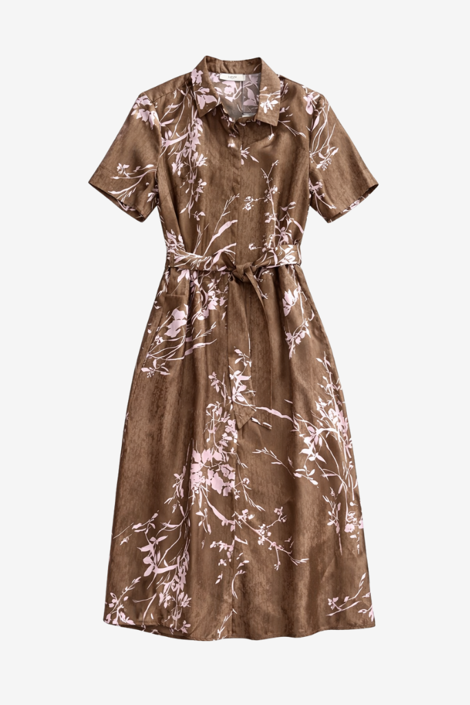 Het blousejurk-ontwerp met klassieke kraag en korte mouwen zorgt voor een elegante, ontspannen look. De bijpassende ceintuur accentueert subtiel de taille en creëert een vrouwelijk silhouet. De botanische garden print in warme, natuurlijke tinten maakt deze jurk tot een echte eyecatcher die zowel overdag als ’s avonds gedragen kan worden. Combineer met sandalen voor een zomerse daglook of met hakken voor een chique diner.