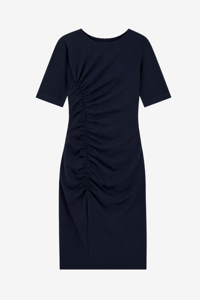 De La Salle Gather Dress navy is een mooie jurk gemaakt van 100% viscose. De jurk heeft een strakke pasvorm en valt tot ongeveer op de knie. Een leuke detail is het rimpel effect aan de zijkant van de jurk.