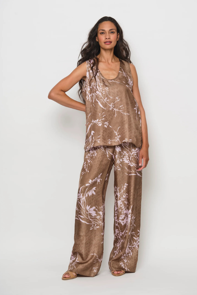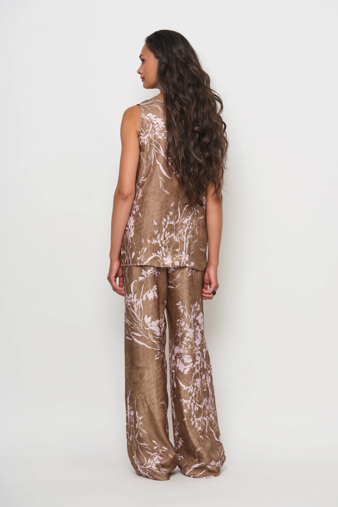 De botanische garden print in zachte, natuurlijke tinten geeft de broek een artistiek en tijdloos karakter. Dankzij de elastische tailleband valt de broek comfortabel en sluit deze mooi aan in de taille, terwijl de stof los langs het lichaam beweegt. Combineer met een zijde blouse of een minimalistische top en sandalen voor een luxe zomerse look, of draag haar met hakken voor een chique avondoutfit.