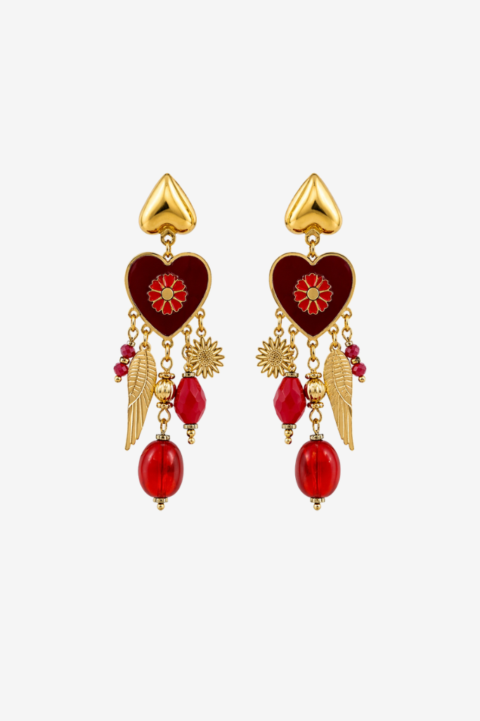 De RIVS Lange Oorbellen Hart en Vleugel Rood zijn speelse statement oorbellen met hartjes, bedels en rode accenten, opvallend en vrouwelijk met een luxe uitstraling.