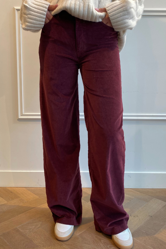 De Lois Palazzo Mistral Corduroy Broek cabernet is een fluweelzachte ribbroek met wijde pijpen en hoge taille in een diepe, elegante wijnrode kleur.