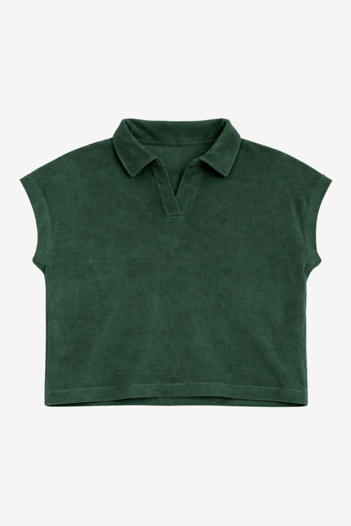 De cropped, iets ruimere pasvorm met korte mouwen en een elegante polo-hals zorgt voor een moeiteloos silhouet. De rijke agavegroene tint voegt diepte toe aan je garderobe en laat zich prachtig combineren met zowel lichte als donkere tinten.