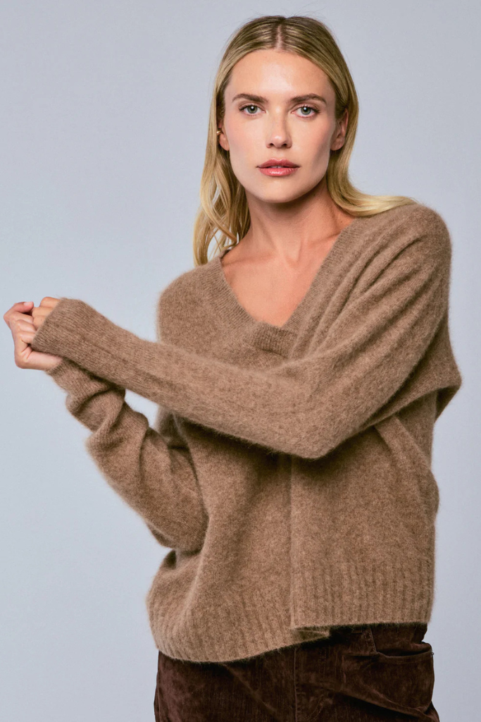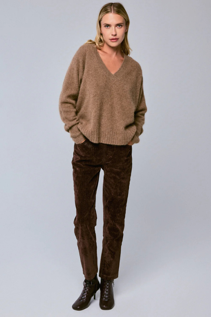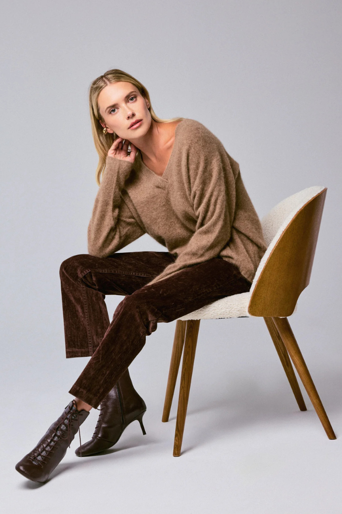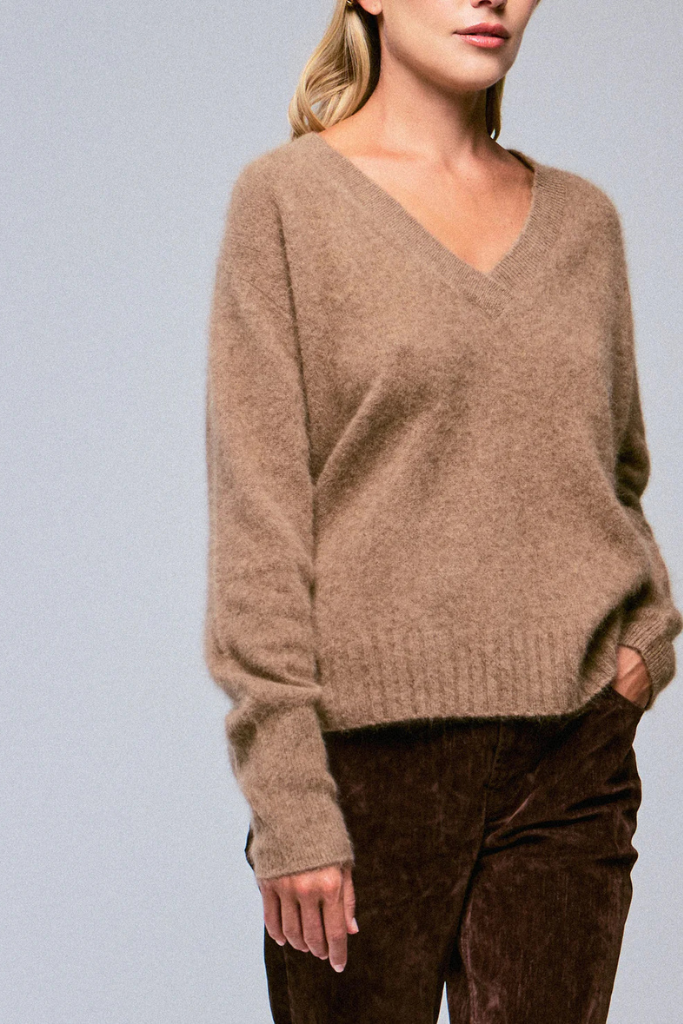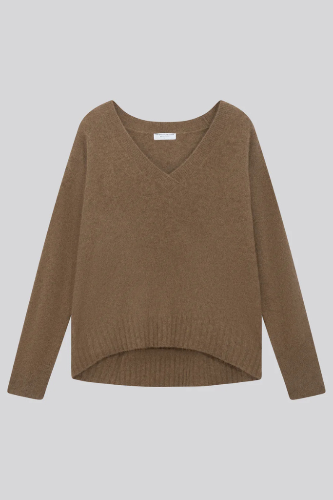 De warme bisontint is een stijlvolle neutraal die moeiteloos combineert met denim, wol of zijde. De diepe V-hals en rechte pasvorm geven de trui een ontspannen silhouet dat perfect is voor laagjeslooks. Valt normaal tot iets ruimer.