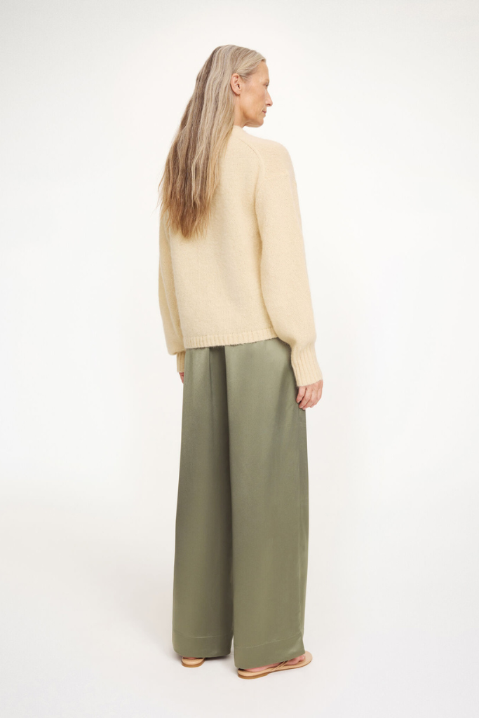 Account aanmakenDe Malene Birger Cabello Pantalon in deep lichen green is een verfijnde en comfortabele broek die moeiteloos stijl toevoegt aan je garderobe. Gemaakt van Eastman Naia™, een duurzame vezel afkomstig van verantwoord houtpulp, is deze broek zijdezacht, sneldrogend en ademend.