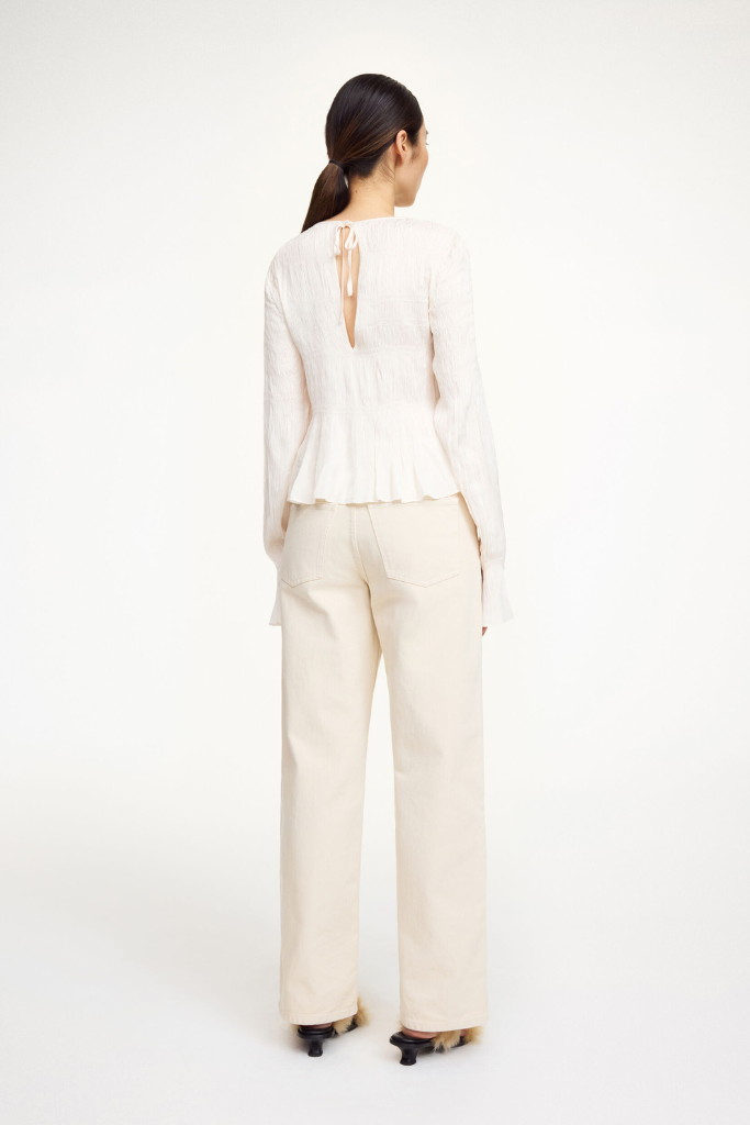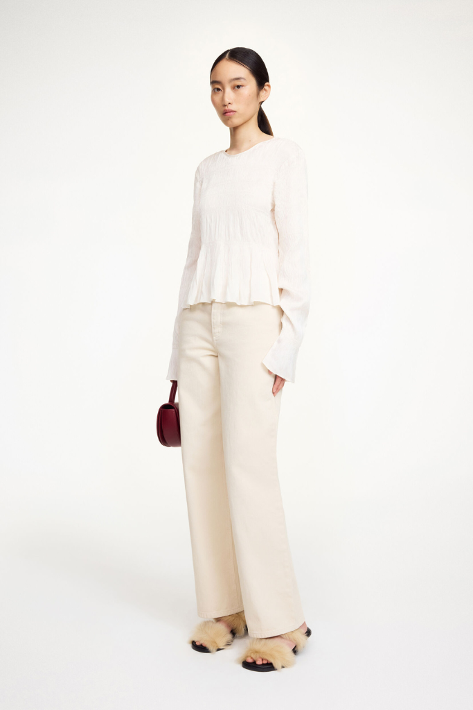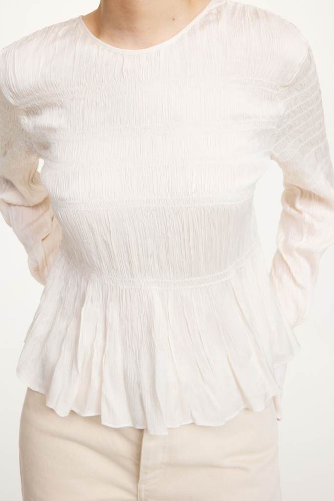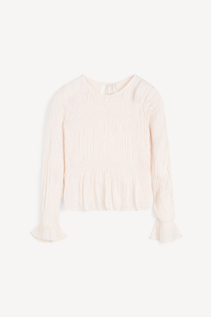 Account aanmakenDe By Malene Birger Ovas Top in cream is een verfijnde blouse met een vrouwelijke pasvorm en rijke smockdetails. Deze top is uitgevoerd in een elastische viscosekwaliteit met LENZING™ ECOVERO™ vezels, wat zorgt voor een vloeiende valling en een duurzamere keuze. De lage rug met striksluiting geeft een elegante, onverwachte twist. Dankzij de verlengde mouwen en ongevoerde afwerking oogt de blouse luchtig en stijlvol.
