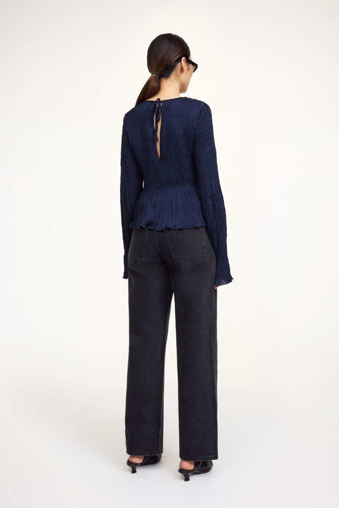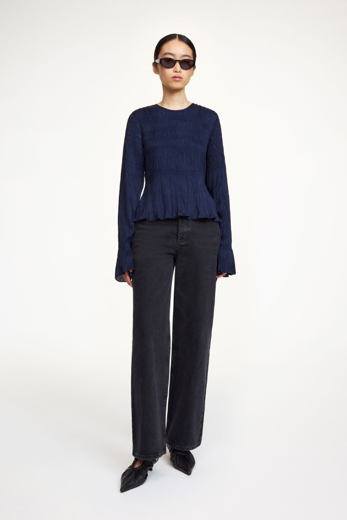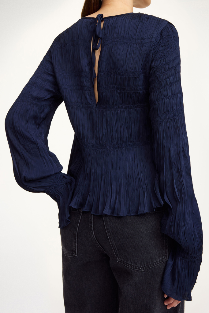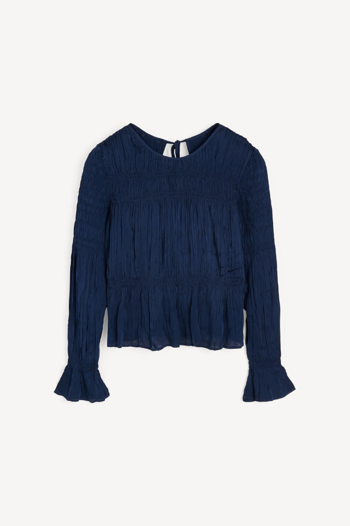Account aanmakenDe By Malene Birger Ovas Top in de kleur Night Sky is een vrouwelijke, verfijnde blouse met een opvallende structuur en elegante afwerking. De top is vervaardigd uit 100% viscose met LENZING™ ECOVERO™-vezels, een duurzamer alternatief met een luxueuze valling. De smockdetails zorgen voor een zachte structuur, terwijl de rugsluiting met strik en de subtiel uitlopende mouwen een sierlijk silhouet creëren. Dankzij de ongevoerde afwerking voelt de blouse licht en luchtig aan op de huid.