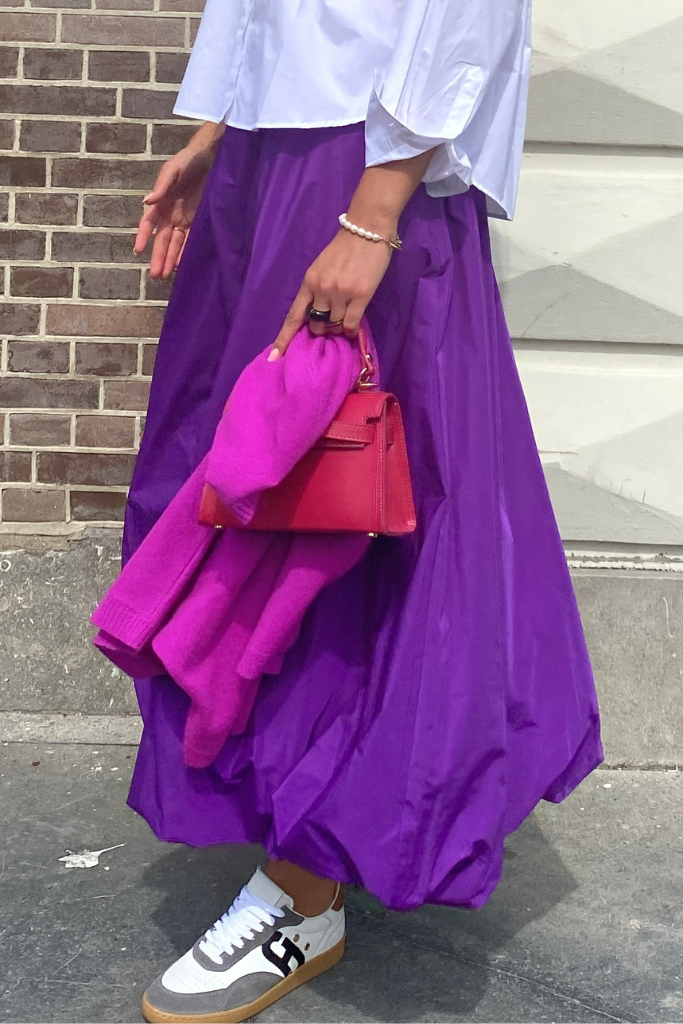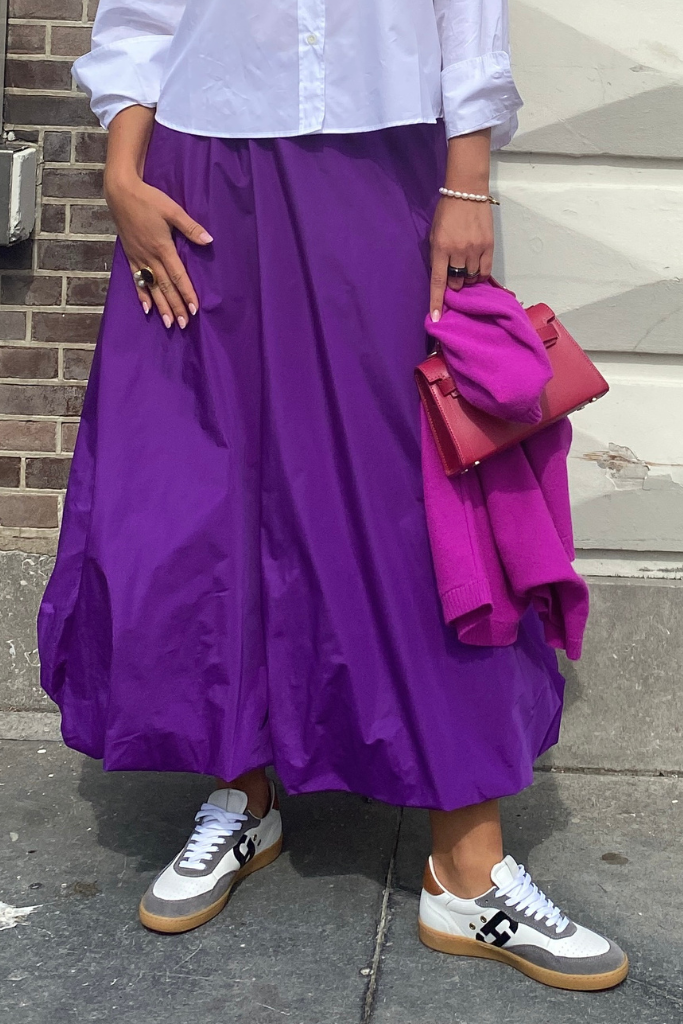 Account aanmakenDe Niù Skirt Coulisse Ume is een echte blikvanger in je garderobe. Deze lange rok in een diepe paarse tint is gemaakt van een hoogwaardige, licht glanzende stof die soepel met je meebeweegt. De verstelbare taille met coulisse zorgt voor een perfecte pasvorm en geeft je de vrijheid om de rok hoog in de taille of wat lager op de heup te dragen.