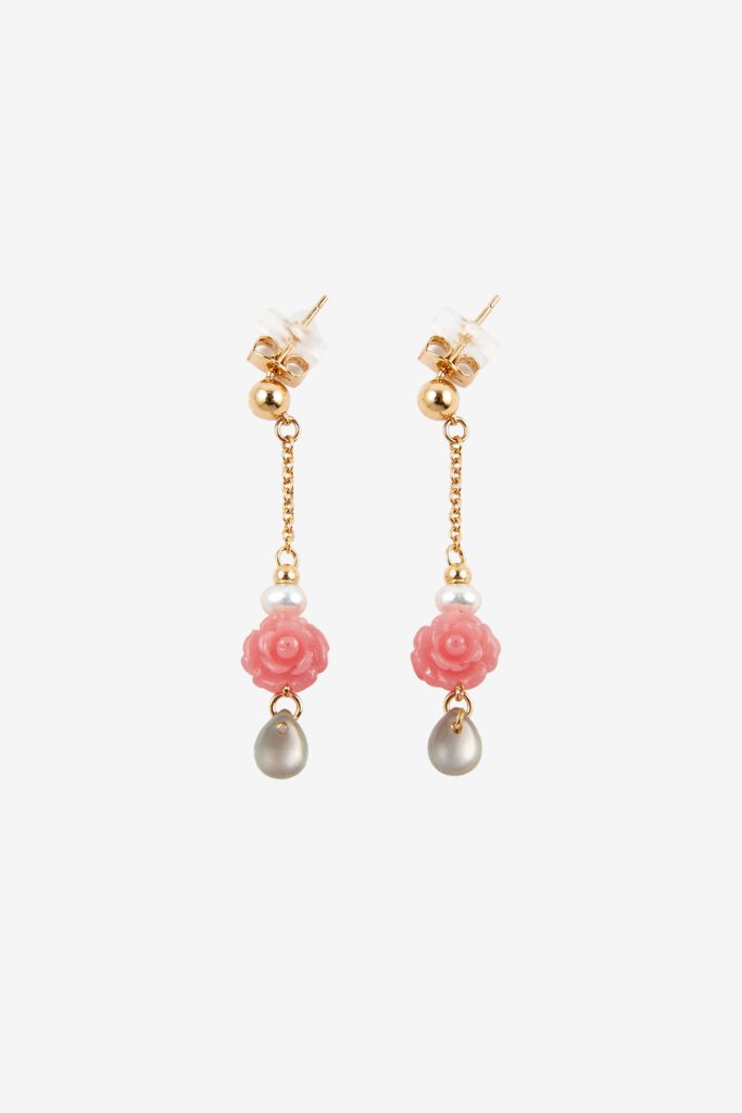 De oorbel heeft een slank, hangend design met een fijne ketting die zorgt voor een sierlijke beweging bij elke stap. De combinatie van materialen geeft een zachte, vrouwelijke uitstraling die zowel chic als modern aanvoelt.