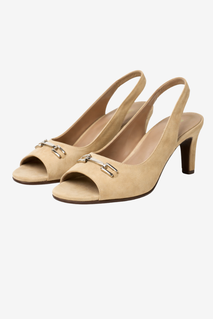 De Panara pump heeft een prachtige beige kleur met een open teen en details aan de voorkant.