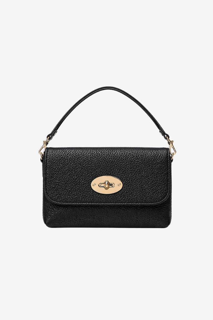 Gemaakt van hoogwaardig, licht generfd leer voelt de tas luxe en duurzaam aan. De klep met goudkleurige draaisluiting geeft een verfijnd accent en zorgt ervoor dat je essentials veilig opgeborgen zijn. De slanke schouderband biedt een elegante draagoptie en maakt de tas comfortabel in gebruik.