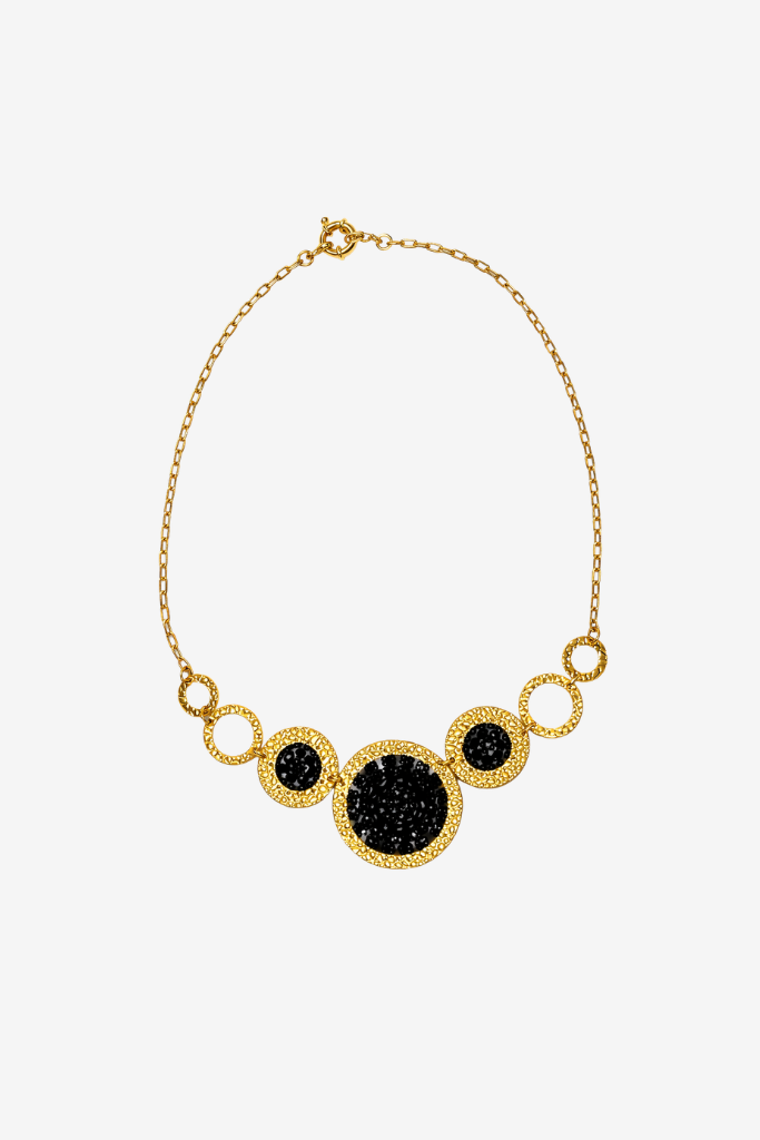 Account aanmakenDe Sàntibé Patagona Necklace noir is een uitgesproken en elegant sieraad dat direct karakter toevoegt aan je outfit. De goudkleurige ketting is verfijnd afgewerkt en voorzien van ronde elementen met diepzwarte stenen. Het grotere middendeel vormt een subtiele blikvanger, terwijl de kleinere cirkels aan weerszijden zorgen voor een mooi uitgebalanceerd ontwerp.