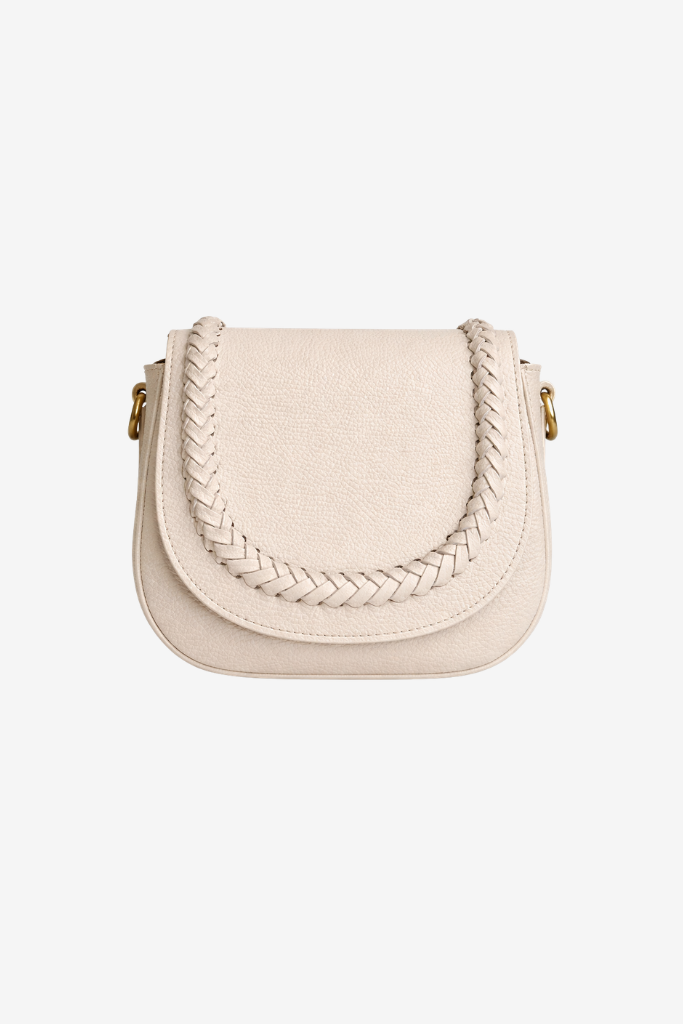 Het ontwerp wordt gekenmerkt door het gevlochten detail langs de flap, wat de tas een unieke en stijlvolle touch geeft. De zachte ecru kleur maakt deze tas perfect te combineren met zowel lichte als donkere outfits.