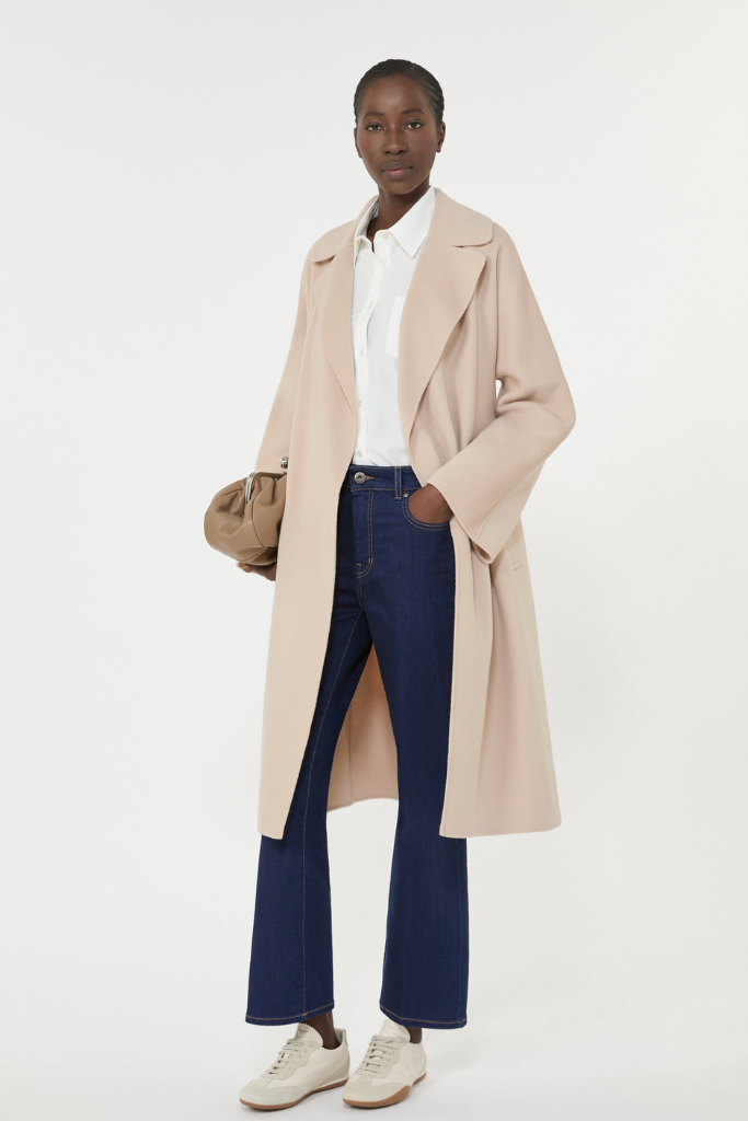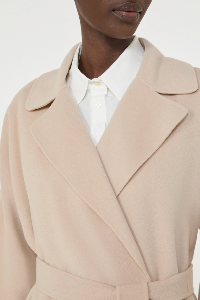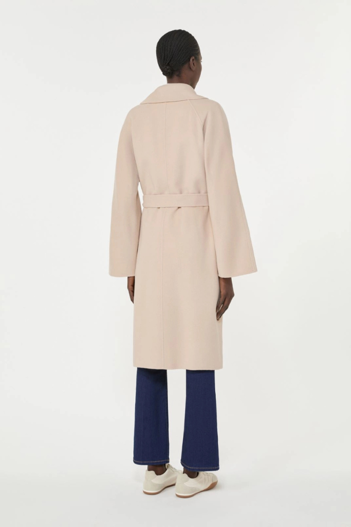 Het design valt recht en lang met een klassieke reverskraag en elegante lange kimonomouwen met raglan‑detail aan de achterkant. De bijpassende ceintuur accentueert subtiel de taille, terwijl de ingewerkte zijzakken praktisch en gestileerd zijn. Doordat het model ongevuld is, oogt de jas licht en soepel — ideaal voor laagjes zonder bulk.