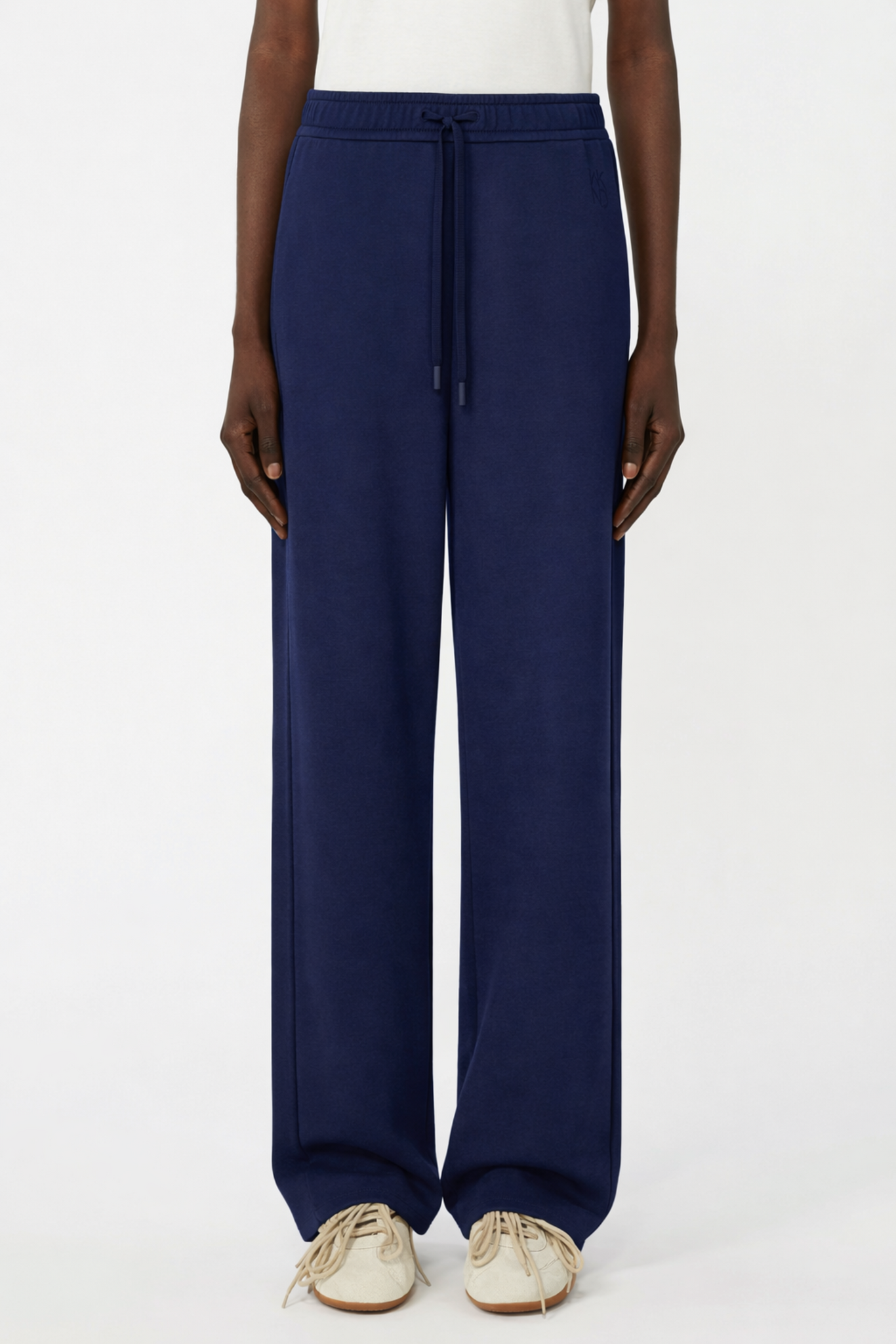 De broek heeft een elastische taille met drawstring voor een verstelbare pasvorm en schuine zijzakken voor praktische functionaliteit. Het subtiele logo‑detail aan de linkerkant voegt een chique touch toe aan het ontwerp, terwijl de zijnaad‑dart voor een moderne belijning zorgt.