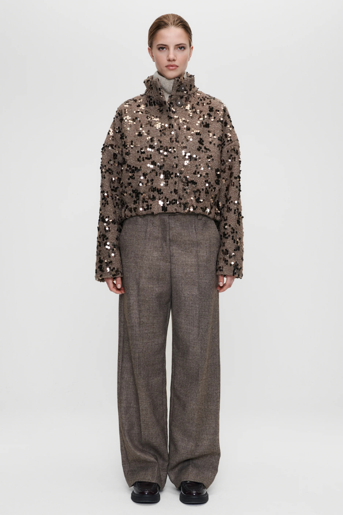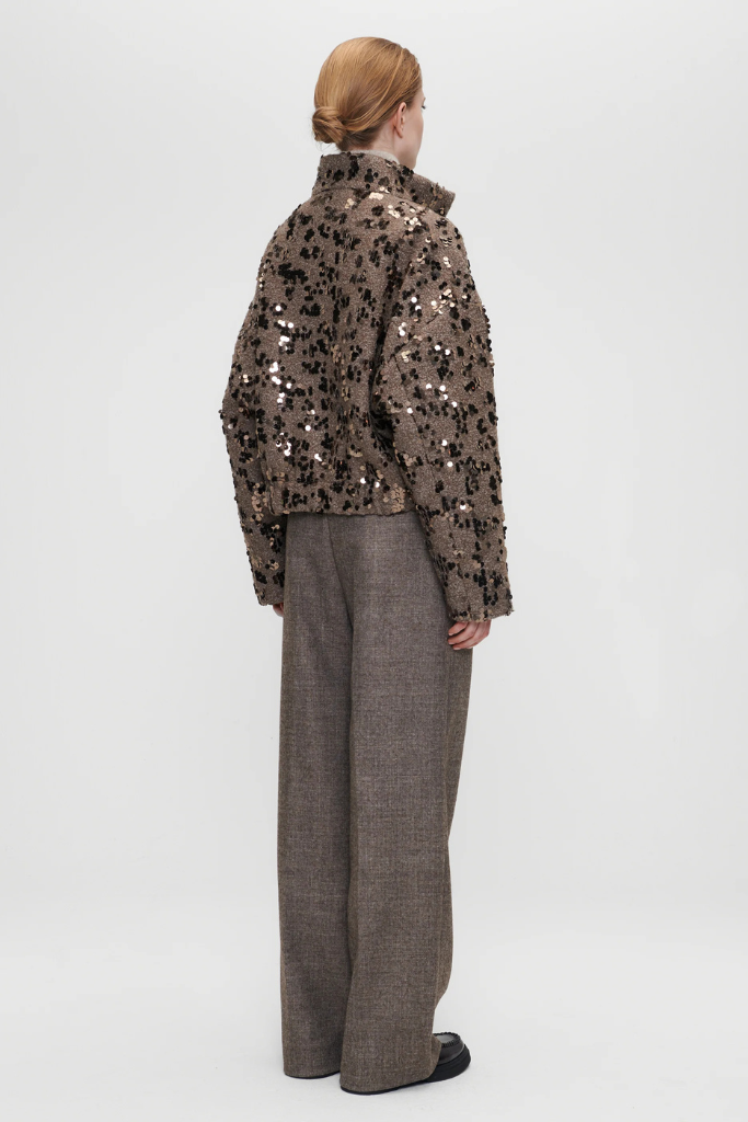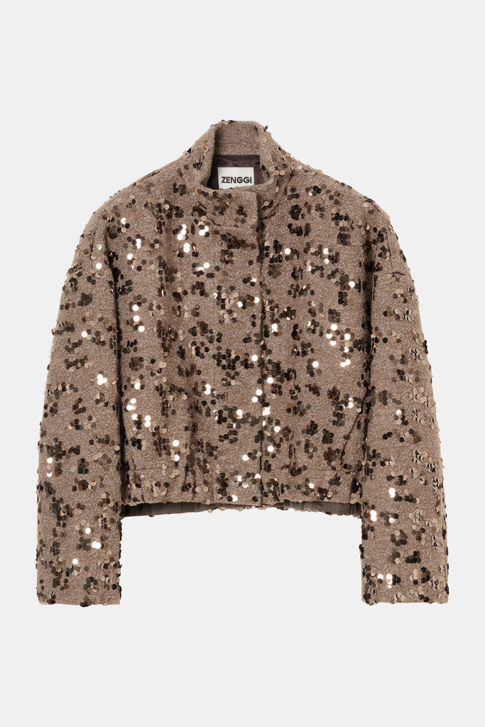 Account aanmakenDe Zenggi Amsterdam Sequin Wool Cropped Jacket in lama is een unieke, feestelijke toevoeging aan je garderobe. Dit korte jasje is gemaakt van een hoogwaardige wolmix (50% wol, 50% polyester) en volledig versierd met sprankelende pailletten in zilver, brons en zwart.