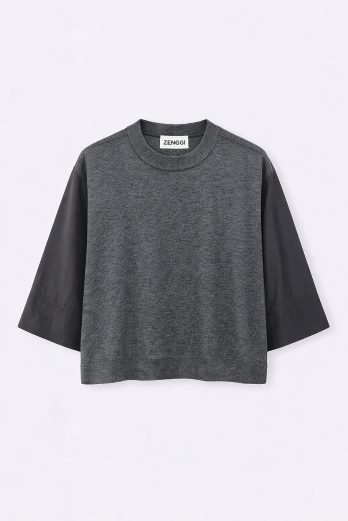 De Zenggi Amsterdam Silk Nylon Knit Mix Top in de kleur slate is een eigentijdse en luxe top die stijl en comfort samenbrengt. Het ontwerp combineert een gebreide body van 75% zijde en 25% nylon met geweven, wijde mouwen, wat zorgt voor een speels contrast in textuur. De subtiele glans van de zijde geeft de top een verfijnde uitstraling.