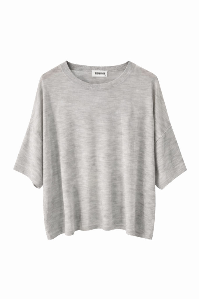 De boxy fit, ronde hals en korte mouwen geven het item een cleane, tijdloze uitstraling die perfect past binnen een garderobe vol rustige luxe. De gemêleerde lichtgrijze tint is makkelijk te combineren en geeft iedere look een verfijnde, minimalistische touch.