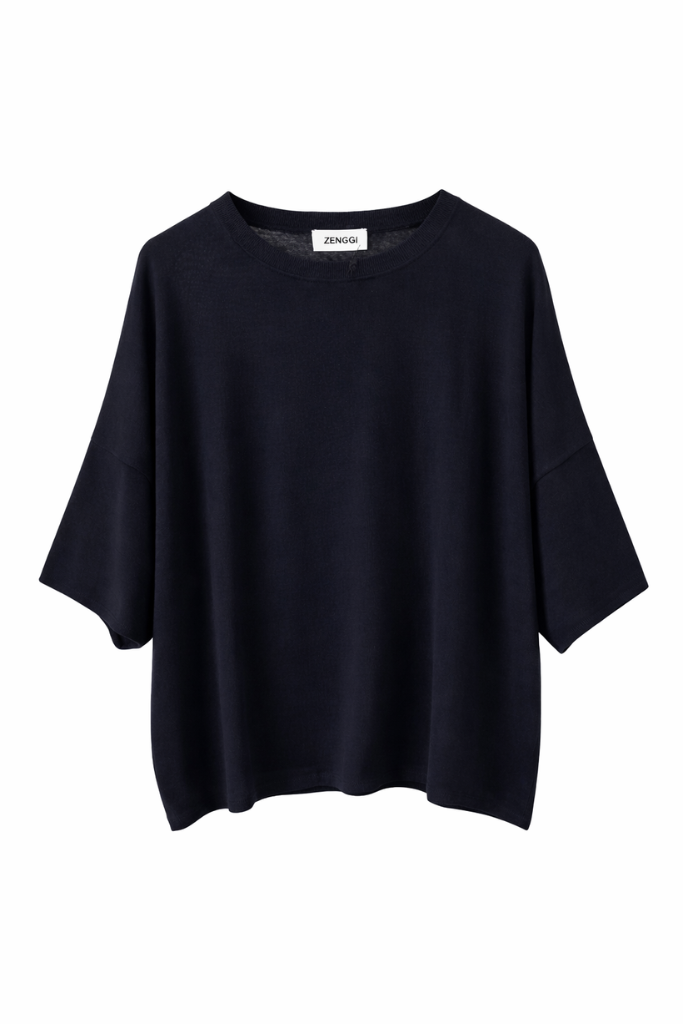 De relaxed boxy fit met korte mouw en subtiel afgeronde zoom geeft een moderne, nonchalante uitstraling zonder aan chic in te boeten. De diepe midnight blue tint is tijdloos en makkelijk te combineren met zowel lichte als donkere onderstukken.