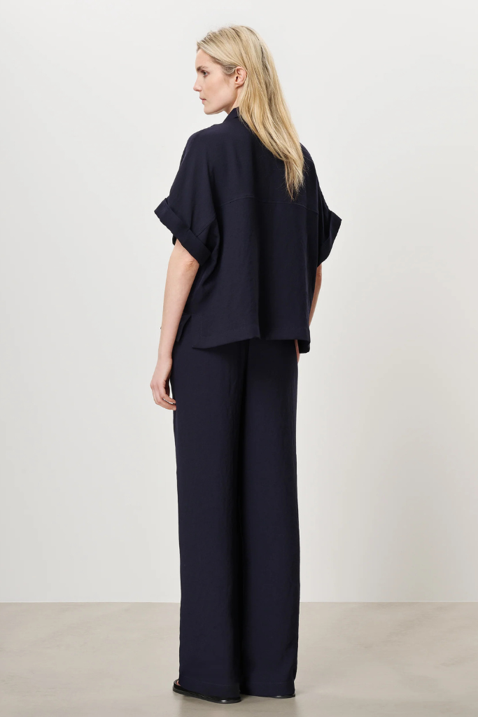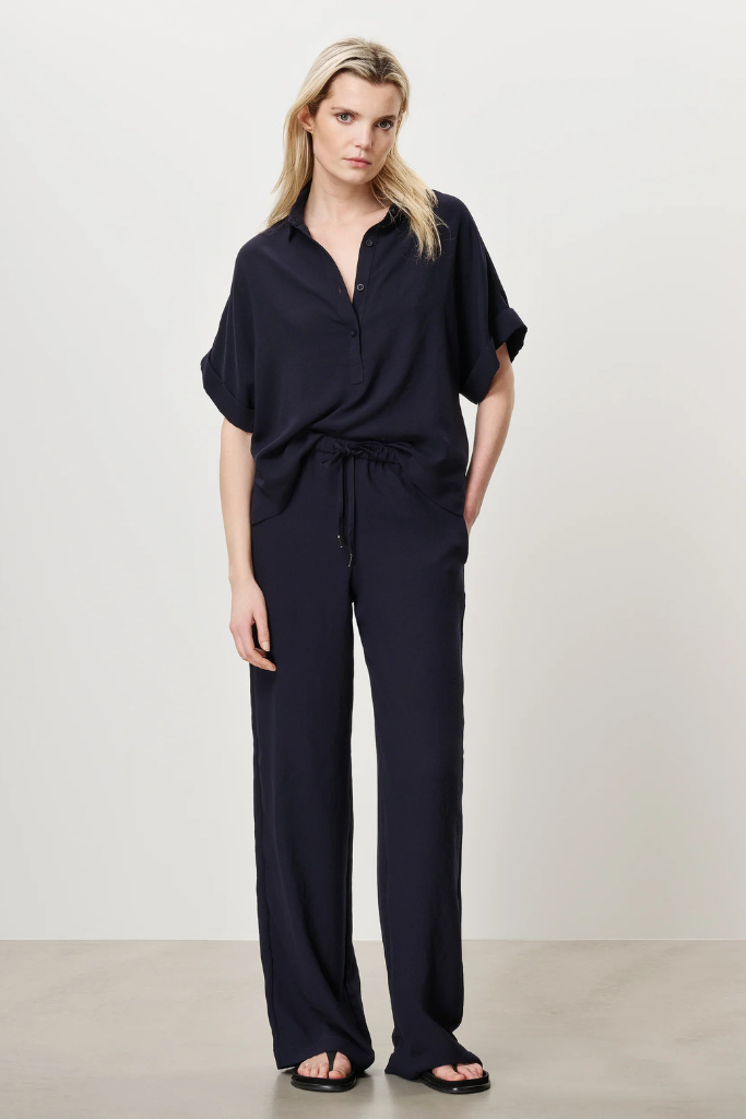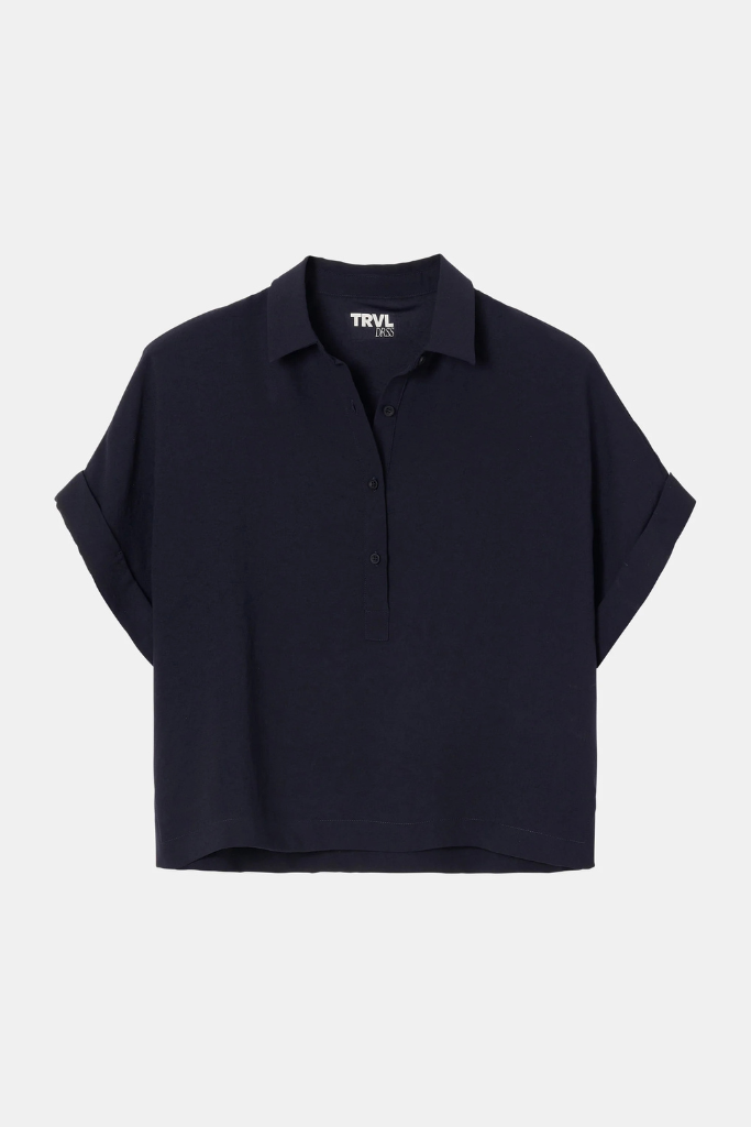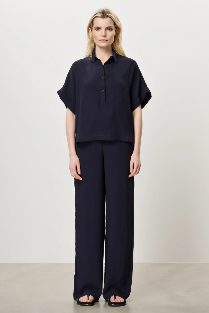 De Zenggi Trvl Drss Aiden Polo Top ink blue is een prachtig, elegante, donker blauwe top en is gemaakt van een luchtige Japanse stof. Het is ruimvallend shirt en voelt daarom zeer comfortabel aan. Het heeft een polo kraagje met knoopjes aan de voorkant. De donker blauwe Aiden polo top heeft opgerolde mouwtjes en is perfect voor als u voor comfortabel, maar luxe outfit gaat. Voor allerlei soorten gelegenheden perfect!